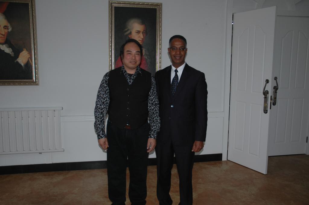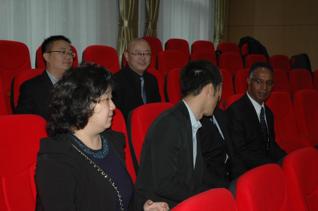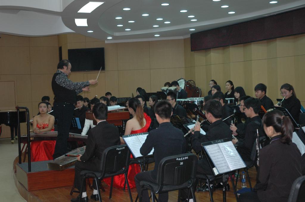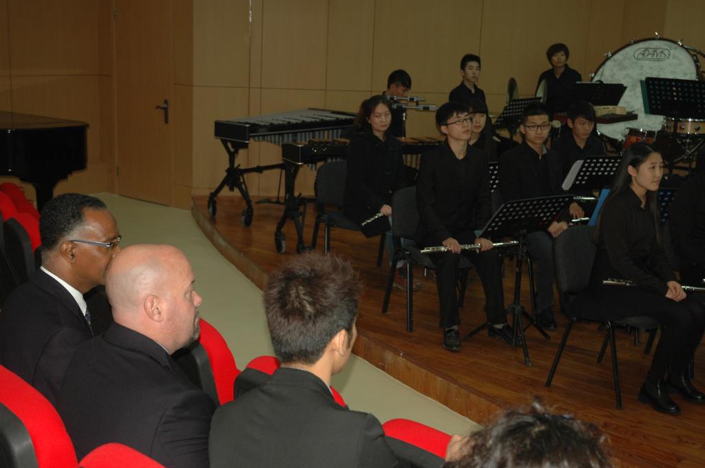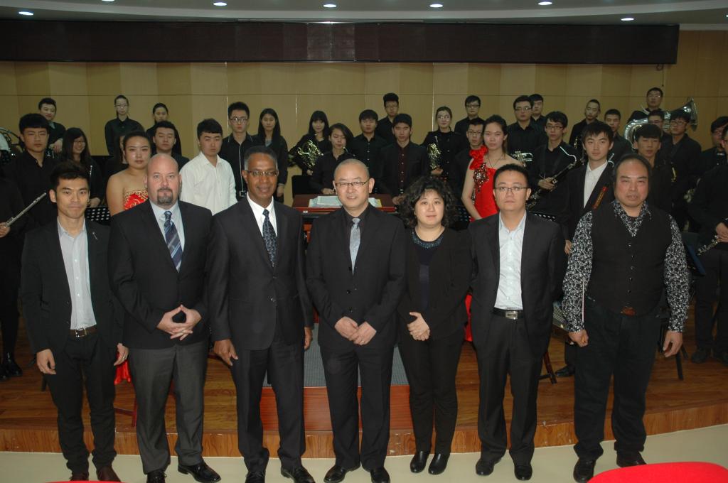 2014年10月31日下午,以音乐和艺术类专业著名加拿大布兰登大学(BrandonUniversity)校长Gervan Fearon博士、国际部主任David Rowland先生一行五人,在国际交流合作处张宗盛处长等人的陪同下,来到了英国正版365教学实践音乐厅,一并观摩了交响管乐团合奏课程的合成排练与民族器乐的展示。学科管理部主任管乐团艺术总监李斌老师主持,向客人逐一介绍并由学生展示每件民族乐器的特点,随后又指挥了一组中外管乐名作,客人们愉快地欣赏了所有的表演节目。结束时校长Gervan Fearon博士非常高兴地表示:他对每位学生认真演奏的态度和严谨的台风以及全心地投入表示真诚地感谢!对李斌老师合成排练及指挥乐队的教学技艺高度赞赏,他说假如这支大学生管乐团放在加拿大的音乐学院里也是一支非常优秀的乐队,由此证明英国正版365管乐团是一支教学严谨训练有素的团队。诚恳邀请李斌老师择机赴布兰登大学音乐学院讲学,并真诚欢迎我们的学生积极报考加拿大布兰登大学音乐学院的硕士研究生。