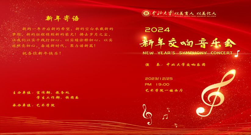 新的一年开启新的希望,新的空白承载新的梦想,新的征程镌刻新的荣光!2023年12月25日晚,中北大学交响乐团以“奋进新时代  聚力谱新篇”为主题举办2024新年音乐会,音乐会以通过精湛的旋律,渲染出中北大学在高质量发展下取得的成效,让我们以实干践行初心、以实绩诠释初心、以实效照亮初心,为冲击双“一流”奏响新的音乐华章。