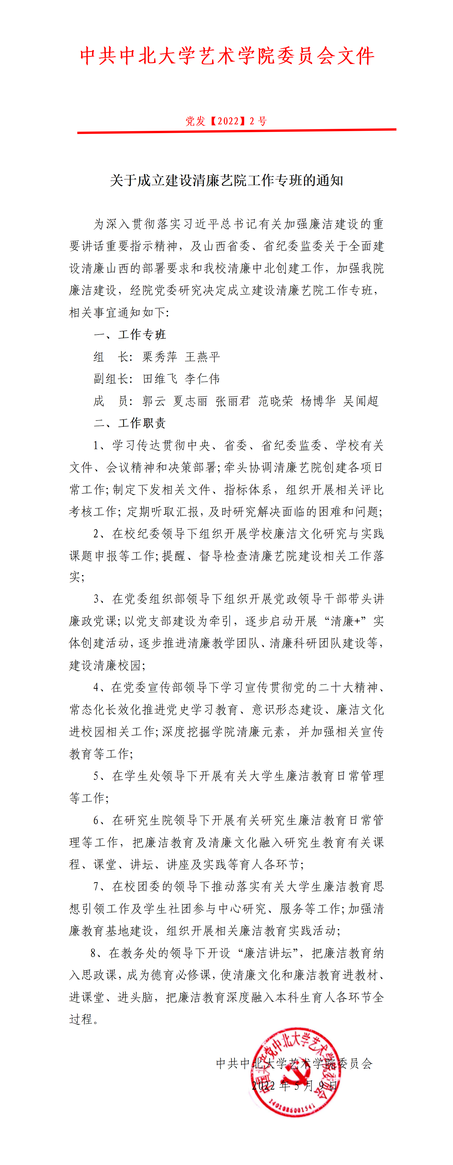 关于成立建设清廉艺院工作专班的通知