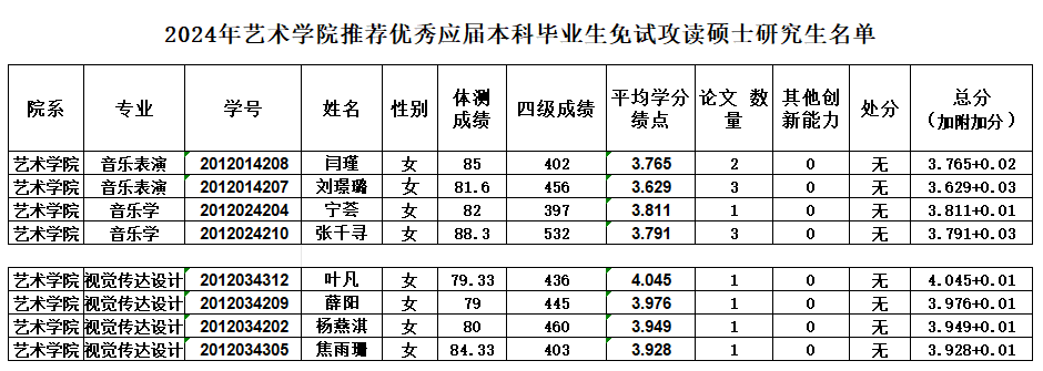 按照学校关于2024年推荐优秀应届本科毕业生免试攻读硕士研究生工作的相关文件精神,经过个人申请、公开答辩,学院推荐工作小组审核,现将结果公示如下。公示期五天(9月21日-9月25日),如有异议,请在公示期内以书面形式向学院教学科反映,电话3924708。
