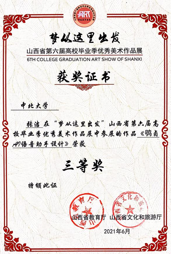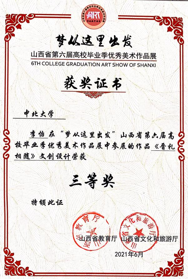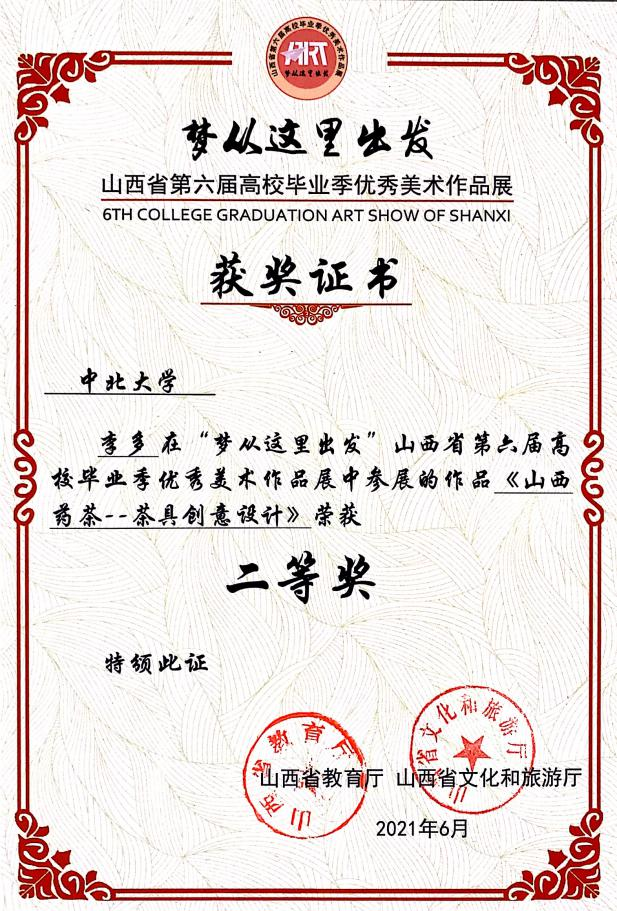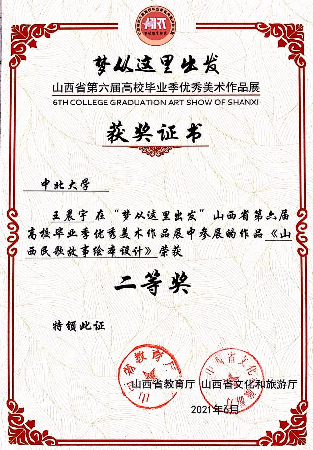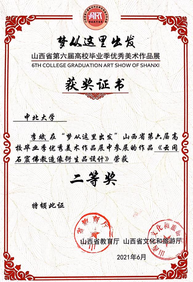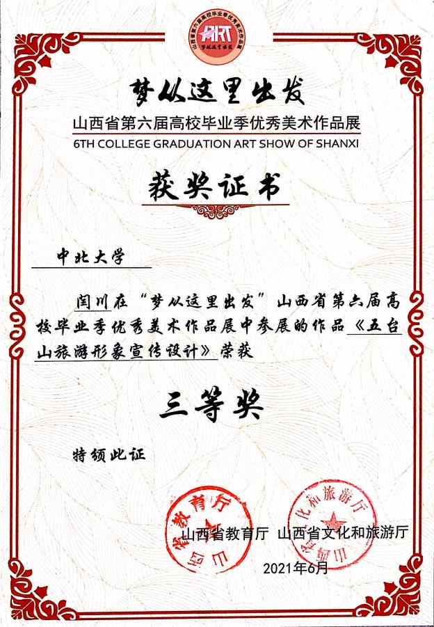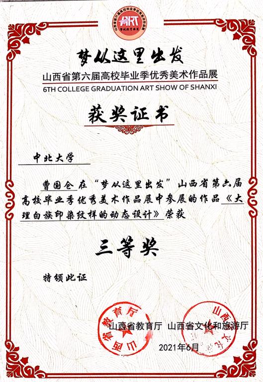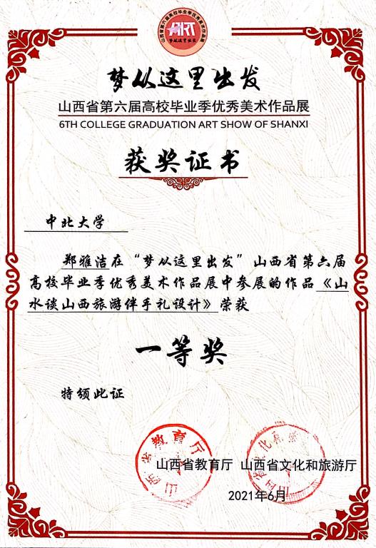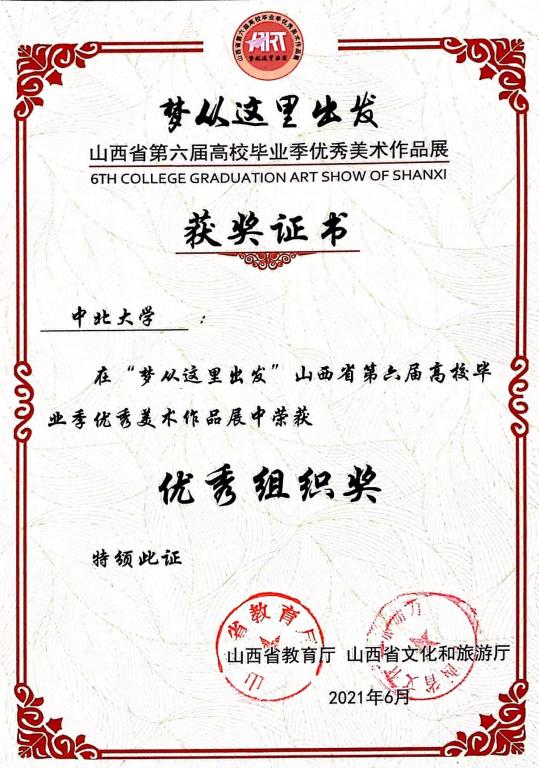 “梦从这里出发”山西省第六届高校毕业季优秀美术作品展于6月10日至7月10日在线上举行。我校获“优秀组织奖”,参赛作品获得21项奖项,其中一等奖2项,二等奖4项,三等奖6项,优秀奖9项,创我校在该项赛事中的最好成绩。