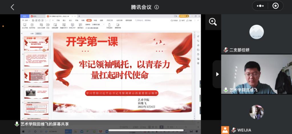 2022年3月4日上午,英国正版365举行了线上“开学第一课”。学院党委副书记田维飞以《牢记领袖嘱托,以青春力量扛起时代使命》为主题,为学院全体学生党员、团委学生会干部、班干部做了一场别具特色的专题讲座,深入学习贯彻习近平总书记考察调研山西重要指示精神。