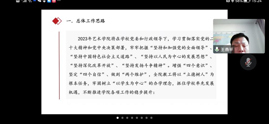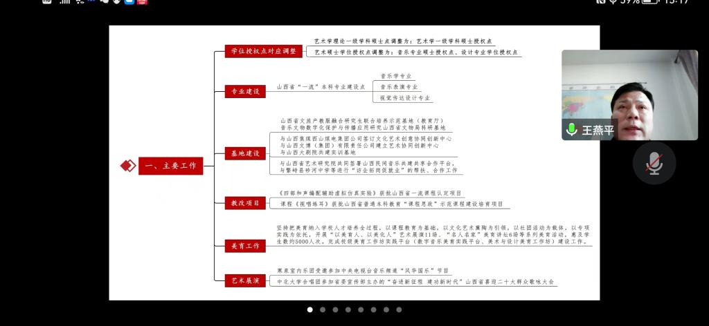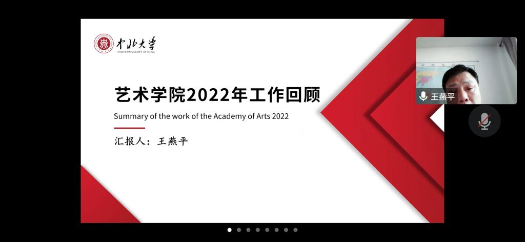 会上,王燕平院长对学院2022年的工作进行了年终总结和2023年工作进行了部署。一是围绕2022年工作目标任务完成情况进行了总结,对学院的科学研究、专业建设、教改项目、美育工作、艺术展演、安全稳定工作和重点创新性工作作了总结;二是重点强调了2023年需要全面推进的工作。即完成《中北大学加强新时代美育工作实施方案》,邀请各类名人名家开展美育讲坛和建立“山西晋剧传习所”“京剧表演传习所”等工作坊,优化师资结构引进具有国字号头衔的学术带头人2名、专业教师2名、科研能力厚重教师2名,申报国家级基金项目1项、省部级项目10余项力争科研经费达到100万元,大力开展“访企拓岗促就业”工作,建设教学实践协同创新中心3个,加强国际交流力度,与境外共建中外联合教学培养基地。