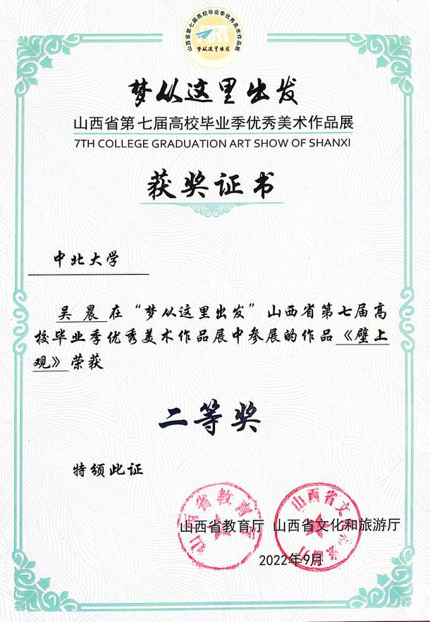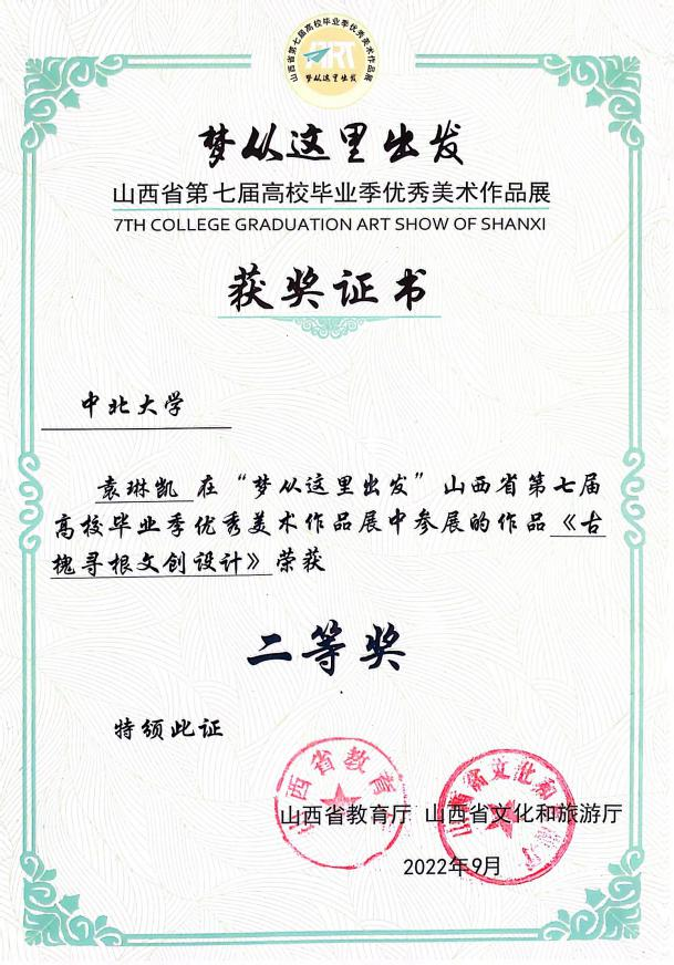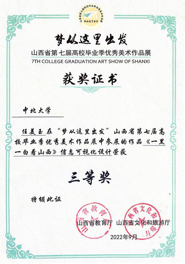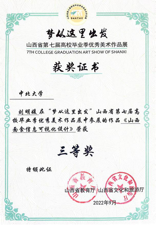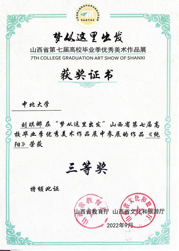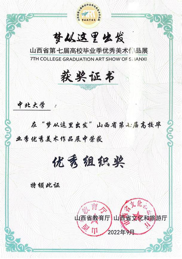 “梦从这里出发”山西省第七届高校毕业季优秀美术作品展于2022年6月10日至7月10日在线上举行。我校获“优秀组织奖”,参赛作品获得30项奖项,其中一等奖3项,二等奖6项,三等奖9项,优秀奖12项,创我校在该项赛事中的最好成绩。