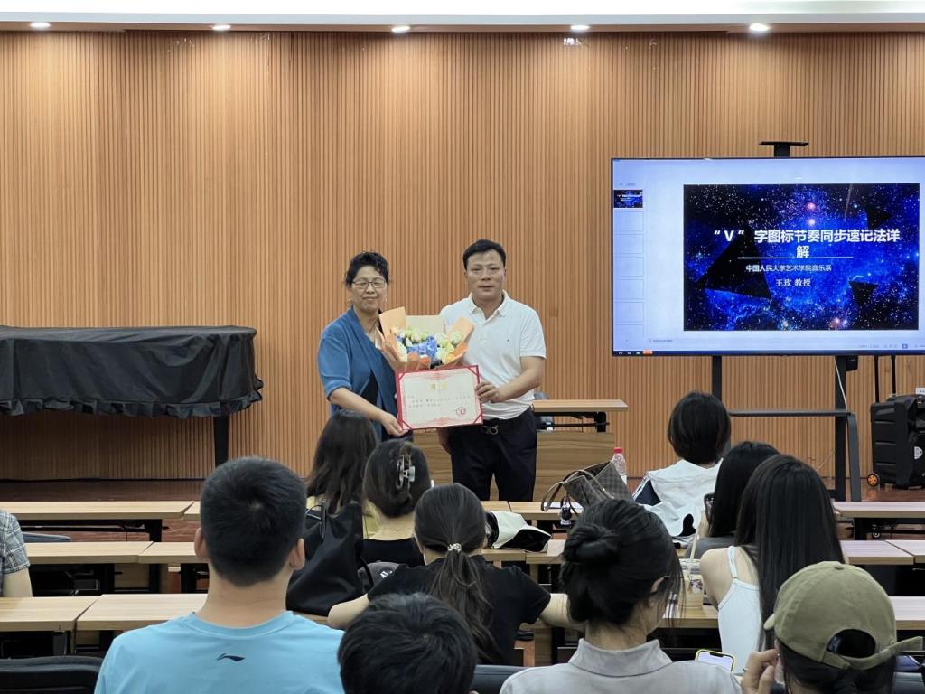 王玫,中国人民大学音乐系前系主任,硕士研究生导师,教授,1984年以来一直从事视唱练耳教学工作,曾在中国音乐学院、中央音乐学院附中及沈阳音乐学院任教视唱练耳课程多年,发表和出版多篇学术论文和题材,其独创的《V字图标节奏同步速记法》目前在我国的视唱练耳的教学领域中作为节奏速记的教学方法被广为使用。多年来作为访问学者多次赴美国、德国、以色列、台湾及国内著名音乐学府进行艺术交流,并成功举办大师班。多次担任专业赛事评委及论坛的嘉宾,2019年成功主持了国家艺术基金项目。此次王玫教授的精彩讲解赢得了学院师生们的高度赞扬,讲座在多次热烈掌声中圆满结束。王玫教授通过对自己教学经验的总结、系统而全面的向同学们介绍了《V字图标节奏同步速记法》,使观众们感触颇深、收获良多,为英国正版365师生们献上了宝贵的一课。