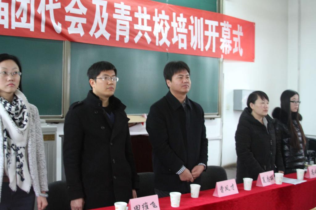 典礼开始,首先进行第一届团代会成员的选举,同学们都认真填写自己的选票并投上这庄严神圣的一票,统计结束后,杜鹃老师,王迪以及张任晨等人入选。之后正式开始青共校培训,首先由曹凤才老师进行以“党的十八届四中全会精神解读”为主题的演讲,教导同学们了解中央委员会以及政府的五大任务,六个原则以及“十六字方针”的解读,倡导新时代大学生应当践行社会主义核心价值观,知法守法。后由田维飞老师对学生干部应该具有的“十种能力”进行深入剖析以及李俊华书记以“学生干部该为同学服务”为主题的激情讲说。同学们致以三位老师雷鸣般的掌声。