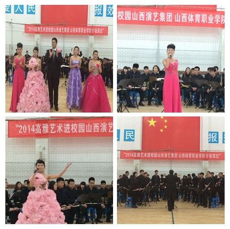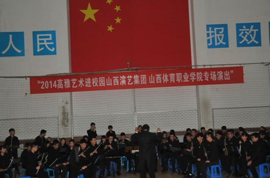2014年11月12日晚7:00,山西体育职业学院综合训练馆大厅灯火通明,这里早已坐满了千余名师生。他们正准备聆听由山西省教育厅、文化厅、山西演艺集团特邀获第三届大学生“雏菊奖”大赛“团队一等奖”获得者“中北大学青年交响管乐团”,代表山西演艺集团赴我省10所高校,进行第三场高雅艺术的巡回演出。音乐总监指挥李斌老师用生动的演讲形式积极与同学们互动,让久旱逢甘雨的同学们了解音乐会与演唱会的本质区别所在。通过对交响管乐队的声部编制及各种乐器音色特点的介绍,使同学们在了解音乐知识的同时,受到了高雅艺术的熏陶。整个音乐会高潮迭起、精彩不断,更使全体师生度过了一个美妙难忘的夜晚。
