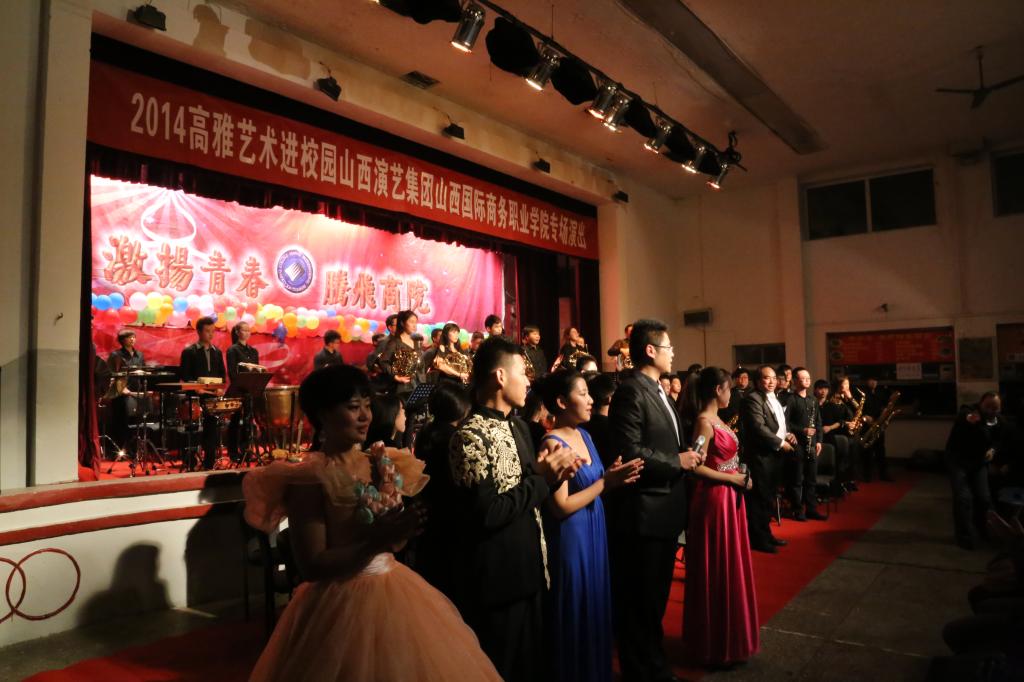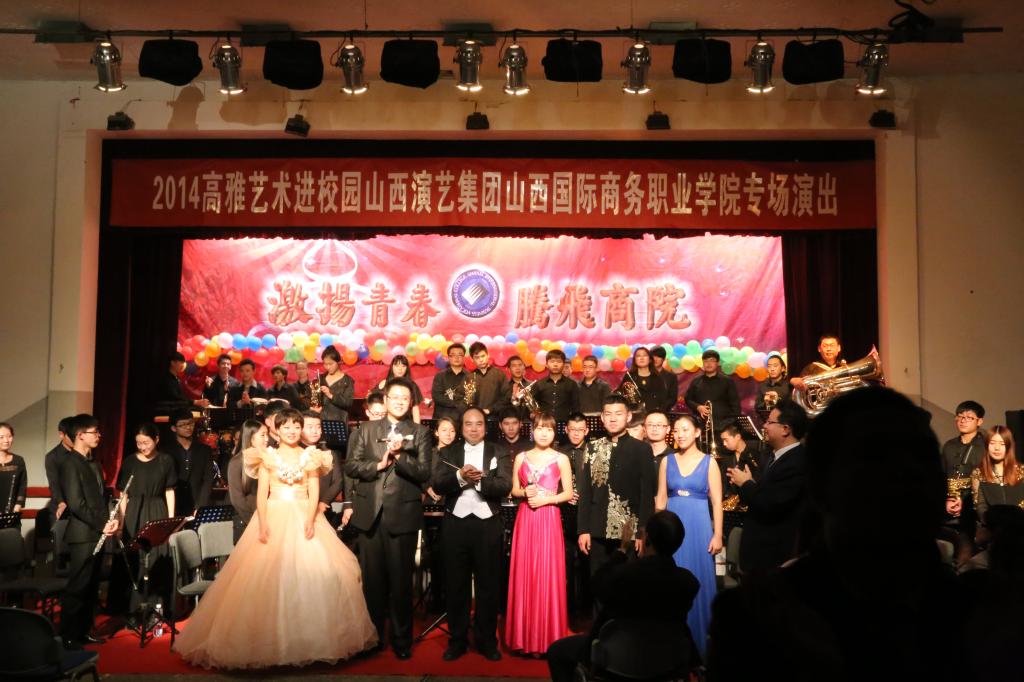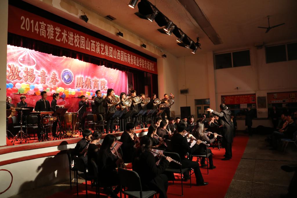 2014年10月22日,英国正版365进行了第二场高雅艺术进校园山西国际商务职业学院专场演出。该系列演出由山西省教育厅、文化厅、山西演艺集团特邀获2014教育厅、文化厅联合举办的大学生“雏菊奖”大赛“一等奖”获得者,“中北大学青年交响管乐团”,代表山西演艺集团进行第二场巡回演出。整场演出使听众们始终激动不已,音乐总监与指挥李斌老师的乐队与作品讲解把观众引向了更加热烈互动的场面。大家纷纷表示,这样的高水平演出形式希望经常来校园演出。