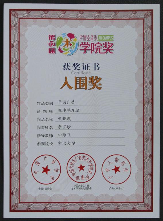 2014年4月至7月,我院组织学生参加了由国家工商总局批准、中国广告协会主办的在第十二届大学生广告艺术节学院奖。经过两个多月的评选,在院党总支副书记田维飞老师的指导下,参赛学生在平面广告类获得佳绩,其中王振同学的王老吉凉茶“青春正能量、我的王老吉”获得优秀奖,李婷婷同学的锐澳鸡尾酒“乐光阳光不在话下、乐享Rio”、李雪珍同学的锐澳鸡尾酒“爱锐澳”和王子君同学的恒安七度空间“薄到你微笑”获得入围奖。这也是我院学生首次在该项赛事获奖,通过本次比赛,参赛同学提升了专业水平与设计经验,相信在今后的赛事中定会取得更好成绩。