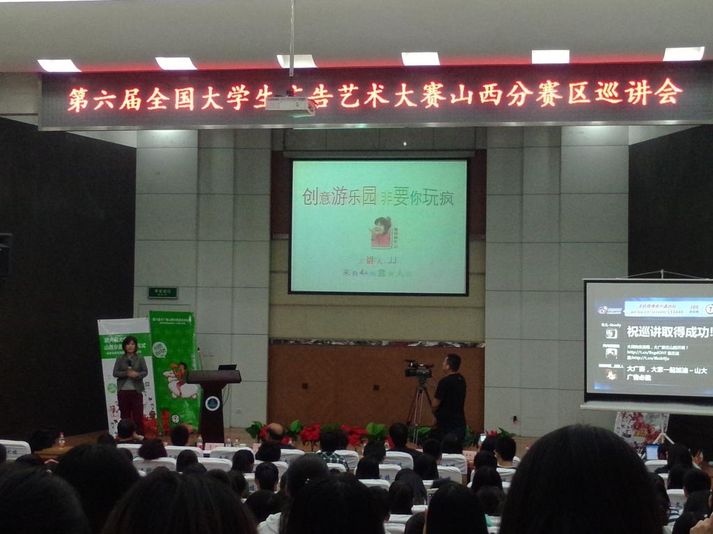 第六届全国大学生广告艺术大赛山西分赛区名家名师校园巡讲山西大学站于2014年5月8日下午14:00在山西大学文科楼报告厅举行。本次活动由全国大学生广告艺术大赛组委会主办,山西大学文学院承办。在我院党总支副书记田维飞老师、学生科夏志丽老师的带领下,组织我校30多名艺术系的学生赴山西大学参加第六届全国大学生广告艺术大赛“创意我成长”山西赛区的启动仪式。