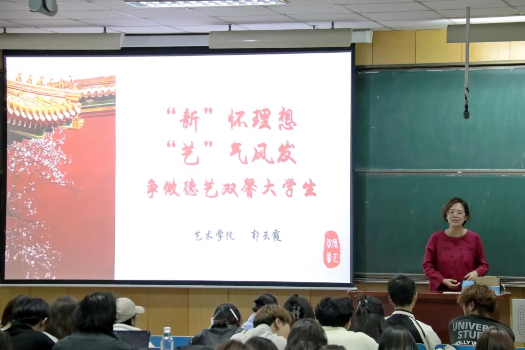 课堂上,郭书记通过“大学四问、了解内心需求、寻找幸福真谛、追寻生命意义”等深刻问题,通过自身的经历与身边的案例,为同学们拨开层层迷雾。她指出价值的创造与实现要在劳动和奉献中创造、在个人与社会的统一中实现、在砥砺自我中实现。她结合党的二十大三中全会会议精神,进一步分析艺术人在中国式现代化发展进程中的任务、使命与前景。她指出新时代大学生应将个人理想融入国家的发展大局,以新思想、新观念、新技术武装自己,为实现中华民族伟大复兴的中国梦贡献力量。通过分析习近平总书记十八大以来关注文化传承的足迹与给各界艺术家们的回信,分析2023感动中国年度人物牛犇何以感动中国,进一步阐明艺术人的价值追求,即“坚持正确政治方向,践行社会主义核心价值观,把为人民创作作为人生追求,坚持社会效益至上,紧扣时代脉搏,崇德尚艺,守正创新,用情用力讲好中国故事,做有信仰、有情怀、有担当的艺术人”。