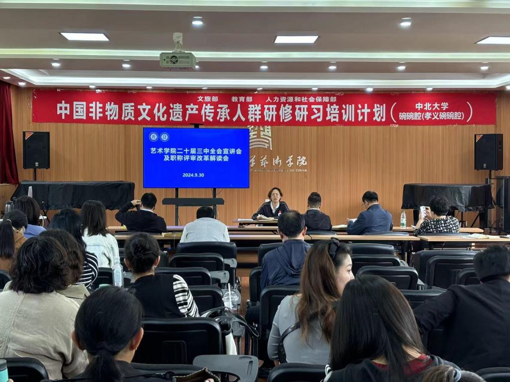 为进一步传达贯彻党的第二十届三中全会下发的工作指示精神,深入落实高等教育现代化改革,同时传达学校下发的《中北大学专业技术职务任职资格评审评审管理办法》文件精神,为学院的艺术教育和科研工作指明方向,2024年9月30日下午3:00英国正版365在鸿学楼二楼东厅召开了二十届三中全会宣讲会及职称评审改革解读会。会议由院长王燕平教授主持,学院领导班子成员、各科室主任、各系主任及全体教职工参加了此次会议。