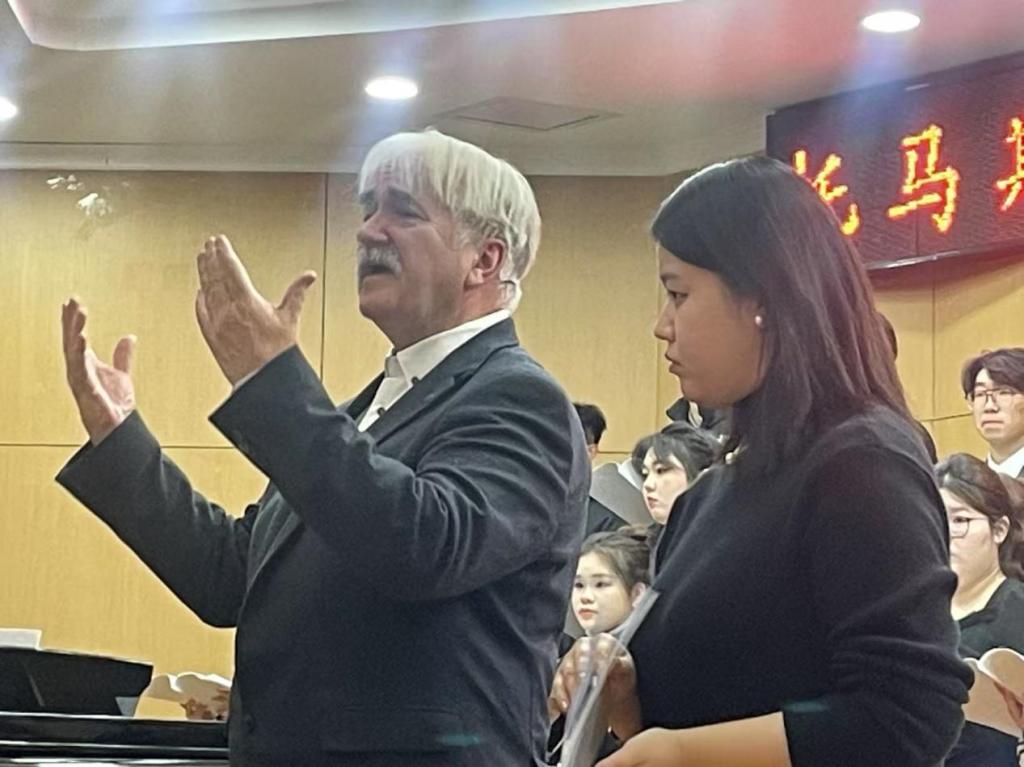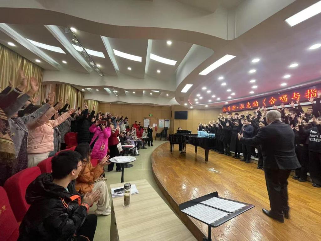 2025年1月9日下午3:30,一场观众与演员全员参与的“托马斯·拉克纳《合唱与指挥》教学成果音乐会”在中北大学泓学楼一层东成功举行。此次音乐会展示了英国正版365音乐系学生们在1月4日——1月9日为期5天密集学习、与拉克纳教授共同努力的成果,吸引了大量合唱爱好者、音乐教育者前来观摩,成为了合唱音乐朋友的一次盛大聚会。