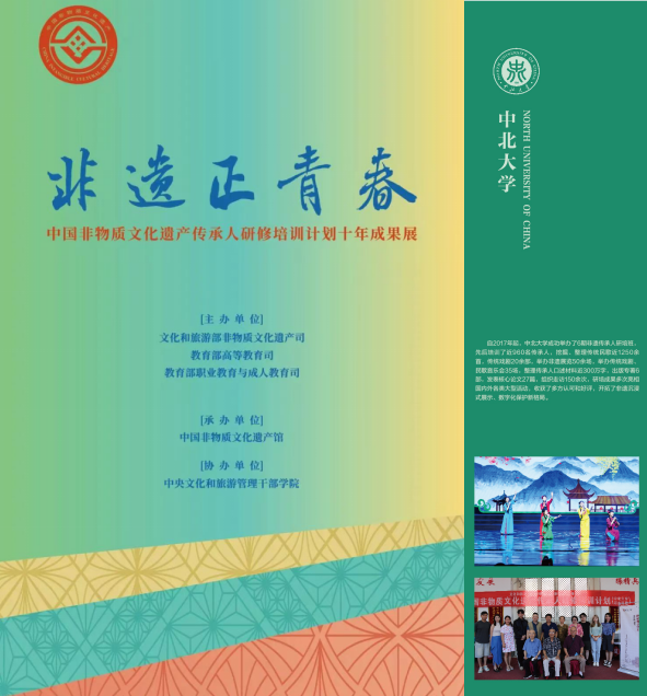展览分为传统工艺、表演艺术、乡村振兴和学术成果4个主题展区,集中展示140余所研培计划参与院校教师和学员的1000余件(套)优秀作品和学术研究成果,全面回顾和系统呈现研培计划实施10年的经验成效。中北大学作为“中国非物质文化遗产传承人研修培训计划”实施十年来的成果“典型案列”,共选送 8 件(套)优秀学员作品、2个表演类节目以及6次研培学术成果汇编参展,同时受邀出席开幕式。