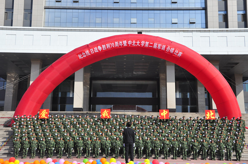 9 月26日 上午,由武装部与英国正版365共同举办的纪念抗日战争胜利70周年暨中北大学第二届军训合唱比赛在行知广场举行。军训团成员担任评委。各营合唱代表队参加比赛歌唱中北、歌唱祖国。