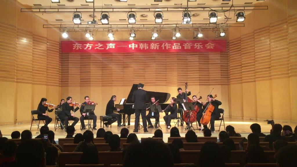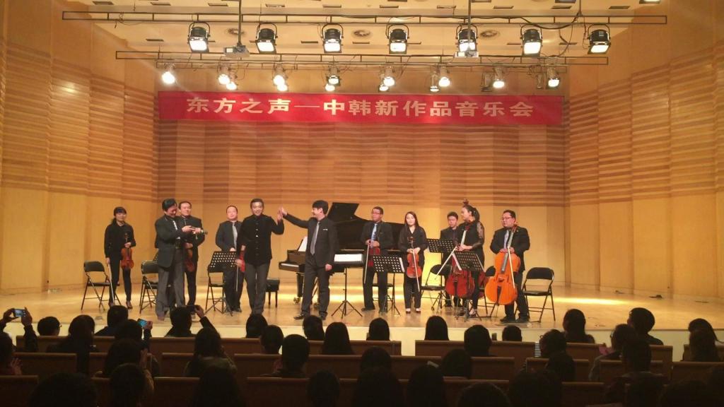 10月28日晚在山西大学音乐厅举行了2015东方之声—中韩新作品音乐会。音乐会首演了中韩作曲家的新音乐作品。受邀的中韩优秀作曲家有-韩国作曲家协会秘书长李震宇教授、中央音乐学院姚恒璐教授、首尔国立大学Seil Oh教授、山西大学刘红兵教授、旅德作曲家马爽等。音乐会上陆晨曦老师与山西省小提琴学会室内乐团合作演奏了刘红兵教授创作的钢琴协奏曲《地上太行》,获得好评。