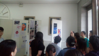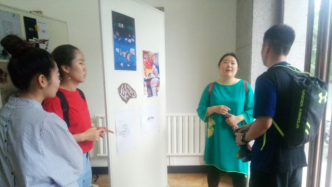 此次展览与以往有所不同,同学们以小组为单位,按小组布置展板展示自己的作品,在中央大道的展出,吸引了全校师生驻足观看,同学们耐心为前来观看的师生讲解。后因天气原因将作品转移到室内,由指导教师张老师亲自为每一组同学的作品进行分析,与同学们进行探讨,对于好的创意老师会积极的进行鼓励,对于一些不足老师也会指出并让同学们加以改正。经过近两个小时的探讨,同时由于天气原因此次展览虽然没能在中央大道上进行过多的展示,但同学们在与老师的分析探讨中对自己的作品又有了新的认识,打开了新的思路,受益匪浅。