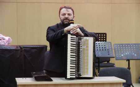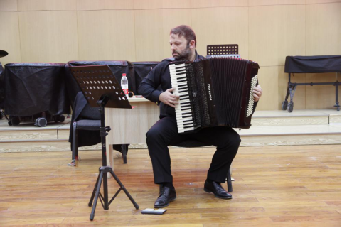 第三部分是手风琴演奏大师课,我们邀请到了山西大学手风琴表演专业的学生,为观众带来了熟悉的《歌声与微笑》与中国传统民歌《对花》等乐曲。在此环节米高先生悉心讲解与现场指导了同学们的演奏,同学们也积极与米高先生交流探讨,现场学习气氛非常热烈。
