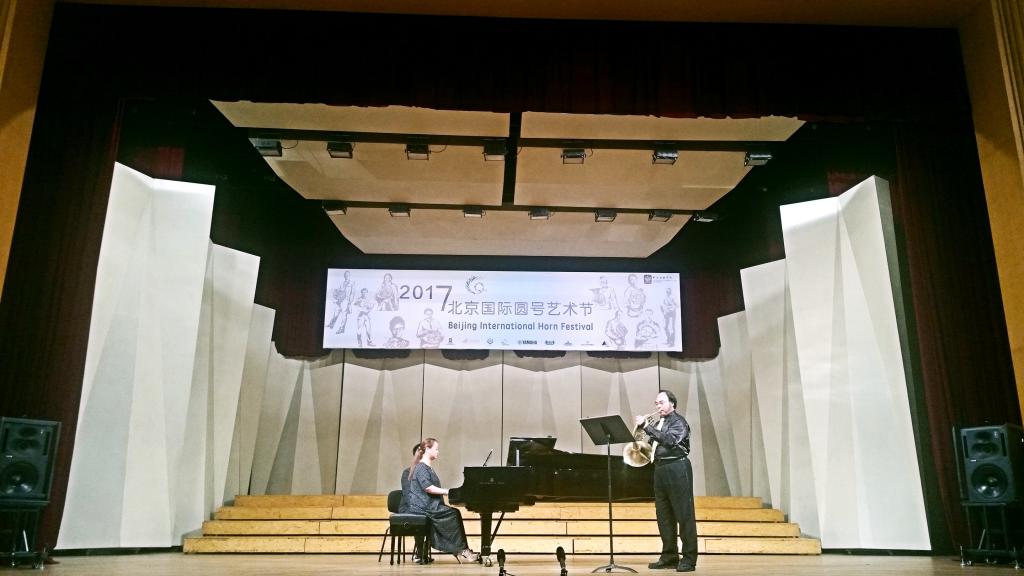 应中央音乐学院管弦系之邀,我院学科管理部主任、圆号演奏家李斌教授于2017年8月2日~6日参加了由中央音乐学院主办的“2017(第五届)国际圆号艺术节”。该活动从2012年创办至今已是第五届了,李斌老师每届活动都得到邀请,但本届还有一个特殊的安排暨“中国圆号演奏家专场音乐会”组台演出,李斌老师以他一贯严谨的艺术风格及扎实的圆号基本功,为艺术节演奏了一曲当代美国作曲家奥图尔-弗莱肯波尔所创作的一首Largo and Allegro,赢得了各位大师和同仁以及来宾的热烈欢迎,该作品为亚洲首演。