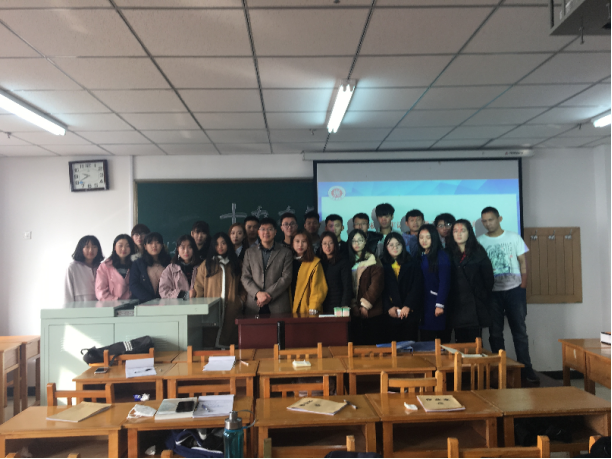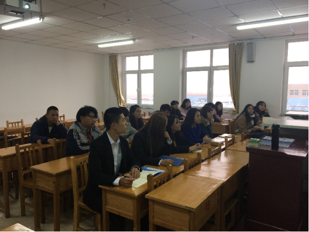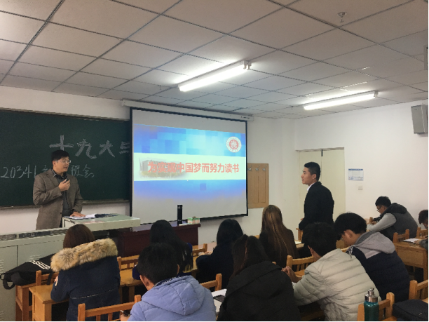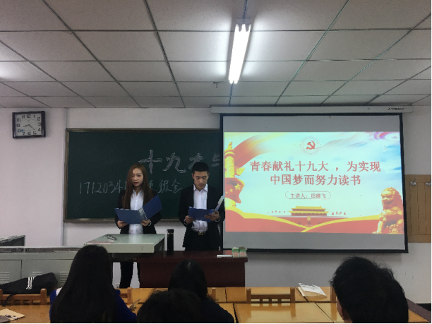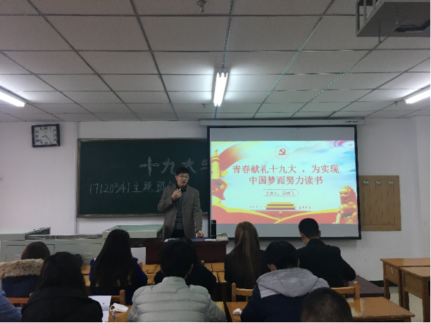 在班长张光年和唐铭悦同学致开场词后,田维飞书记开始了题为«青春献礼十九大,为实现中国梦而努力读书»的讲座。