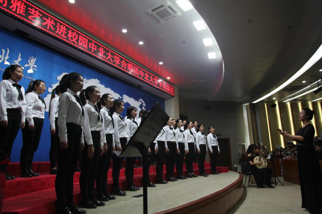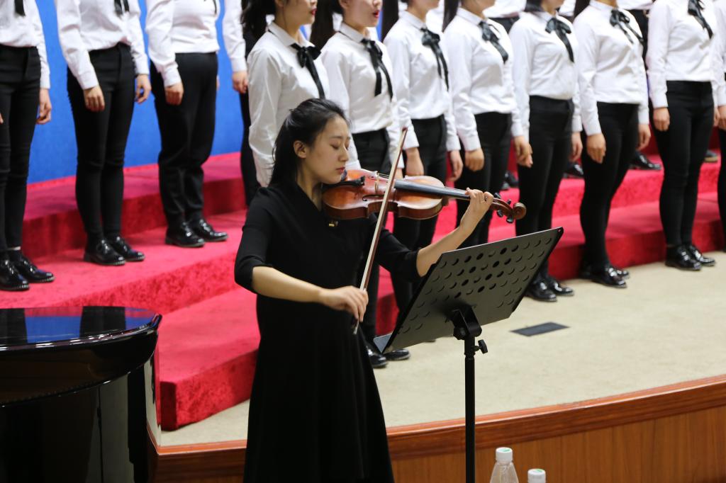 音乐会上,所有的合唱曲目在全团成员的共同演绎下极富感染力,赢得了现场师生的阵阵掌声。此外,在演唱过程中还穿插了钢琴、小提琴等器乐合奏。