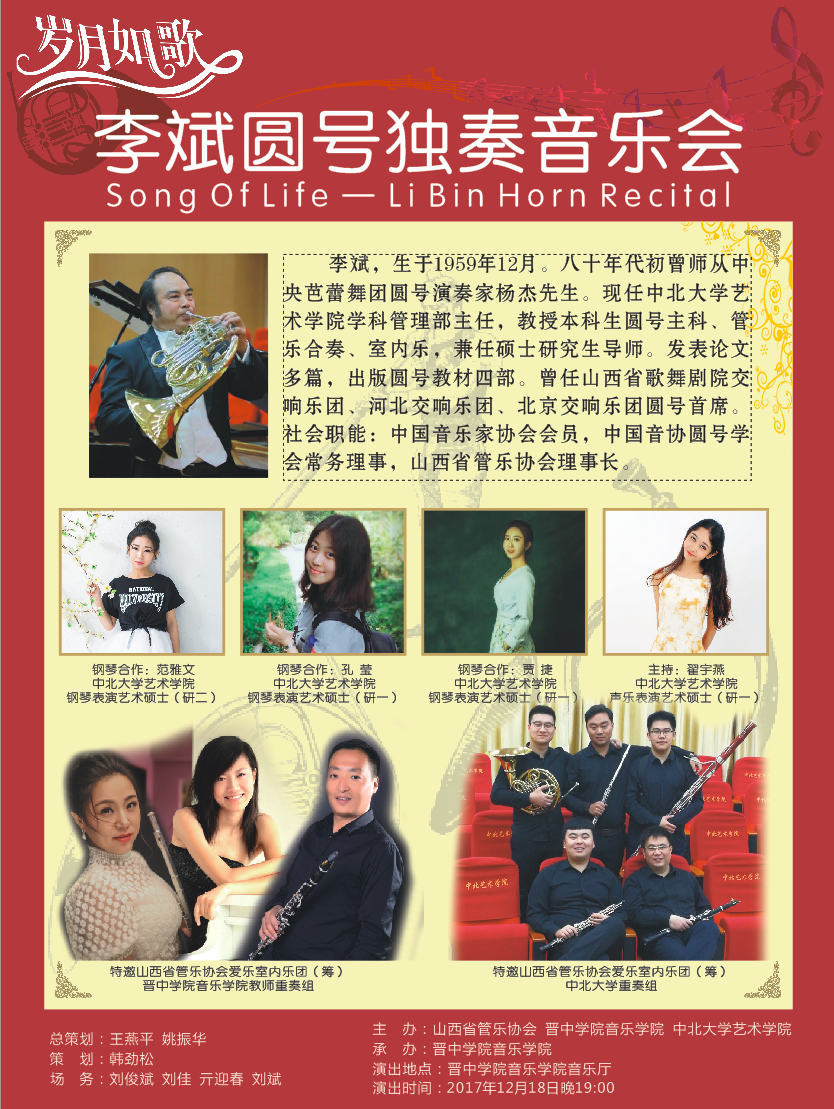 2017年12月18日晚,山西省管乐协会理事长、英国正版365学科管理部主任李斌老师在晋中学院音乐厅举办了题为“岁月如歌”的圆号独奏音乐会。此次音乐会由王燕平院长等担任总策划,由山西省管乐协会、英国正版365、晋中学院音乐学院三方联合主办,晋中学院音乐学院承办。