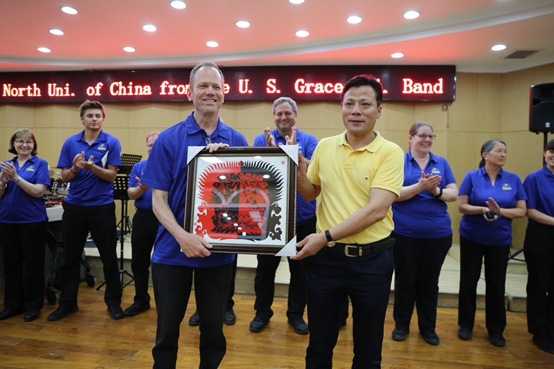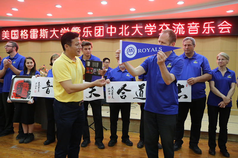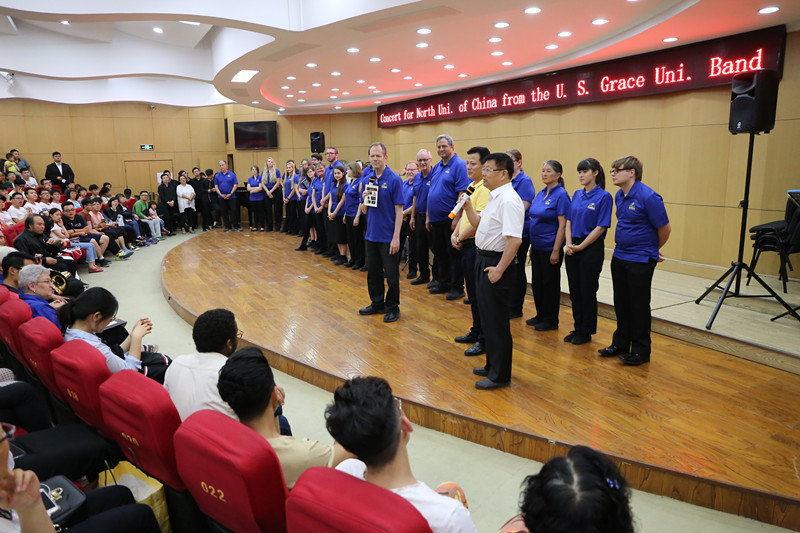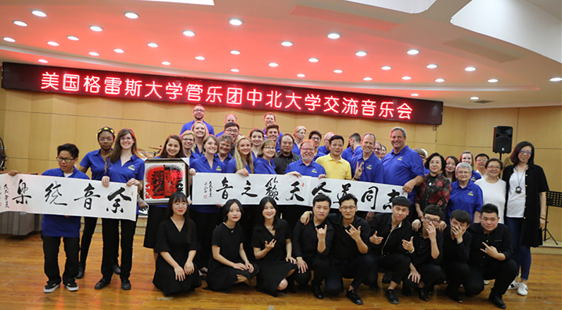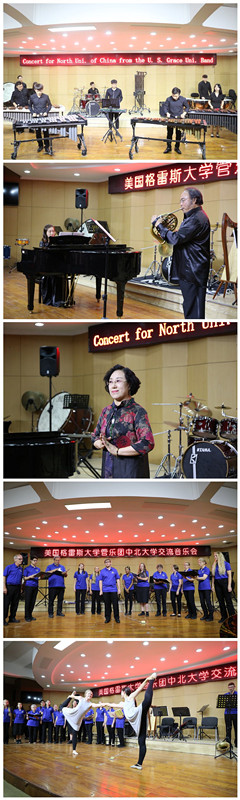 来自格雷斯大学管乐团的演奏家们倾情演绎了长号四重奏《木偶进行曲》、单簧管四重奏《角笛舞曲》、木琴独奏《坐立不安的罗伯特》,以及乐团成员带来的五首合唱歌曲和具有美国特色的电影金曲。我院冯亚琴老师也登台演唱,为远道而来的客人送上了内蒙古民歌《天边》,李斌老师带来了圆号独奏《草原音诗》等精彩节目。最后演出在美国国歌《星条旗永不落》中圆满落幕。