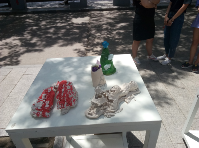 同学们将自己的作品摆放在展台上于十二号楼前展览。