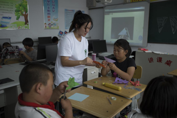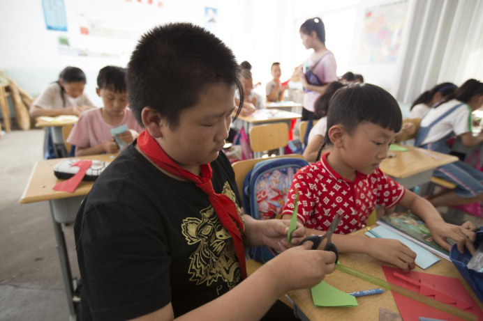 (图:孙美鑫同学正在辅导学生做剪纸)