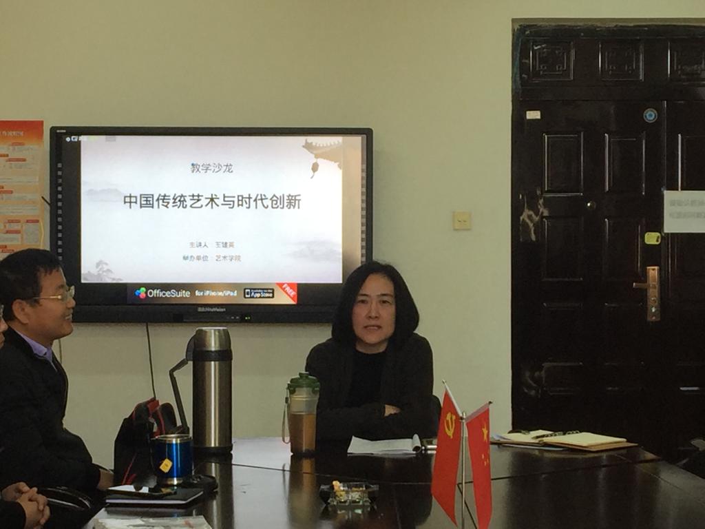 2018年10月9日下午,英国正版365在9号楼英国正版3655层519(小会议室)举办了主题为“中国传统艺术与时代创新”的教学沙龙,主讲人为王建英老师,学校新入职教师及学院相关教师参加了本次教学沙龙。