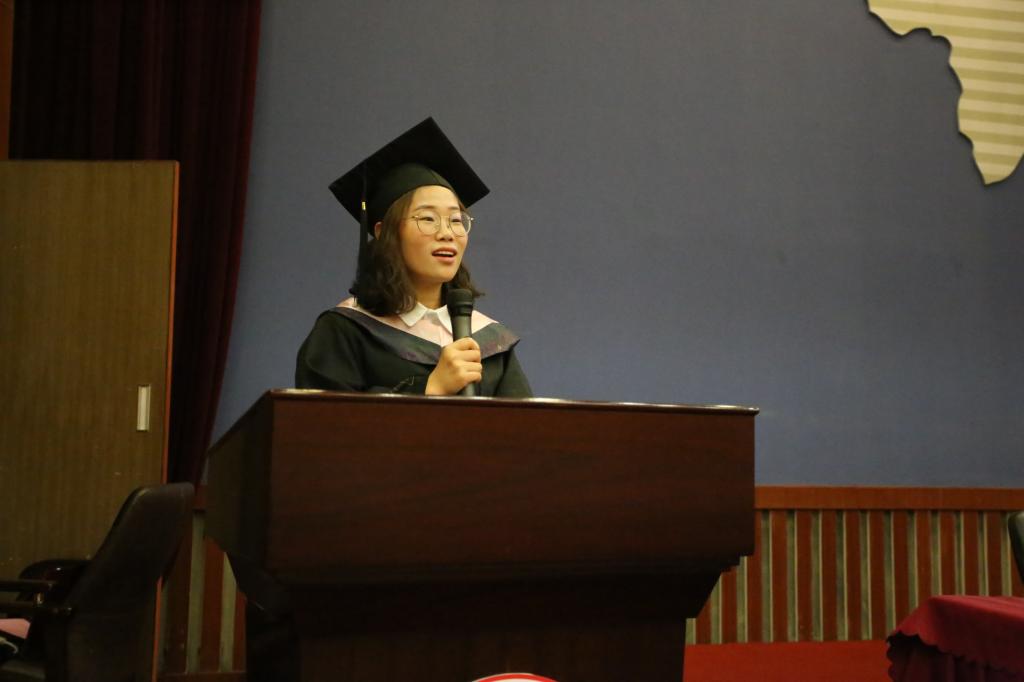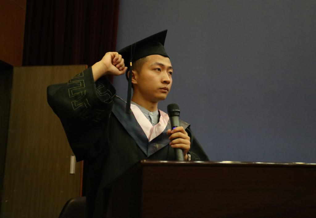 优秀毕业生代表郭旭在她的发言中不仅感谢老师们同学们对她成长成才的付出,总结了大学四年的收获。毕业之后她勇敢地选择了去遥远的新疆基层工作,时刻铭记习近平总书记对青年的嘱托“到基层和人民中去建功立业,让青春之花绽放在祖国最需要的地方,在实现中国梦的伟大实践中书写别样精彩的人生。”在祖国西部的广阔天地中大有作为,将自己的命运与时代脉搏与祖国的命运紧紧的联系在一起,身体力行践行合格党员,成为学弟学妹的榜样。