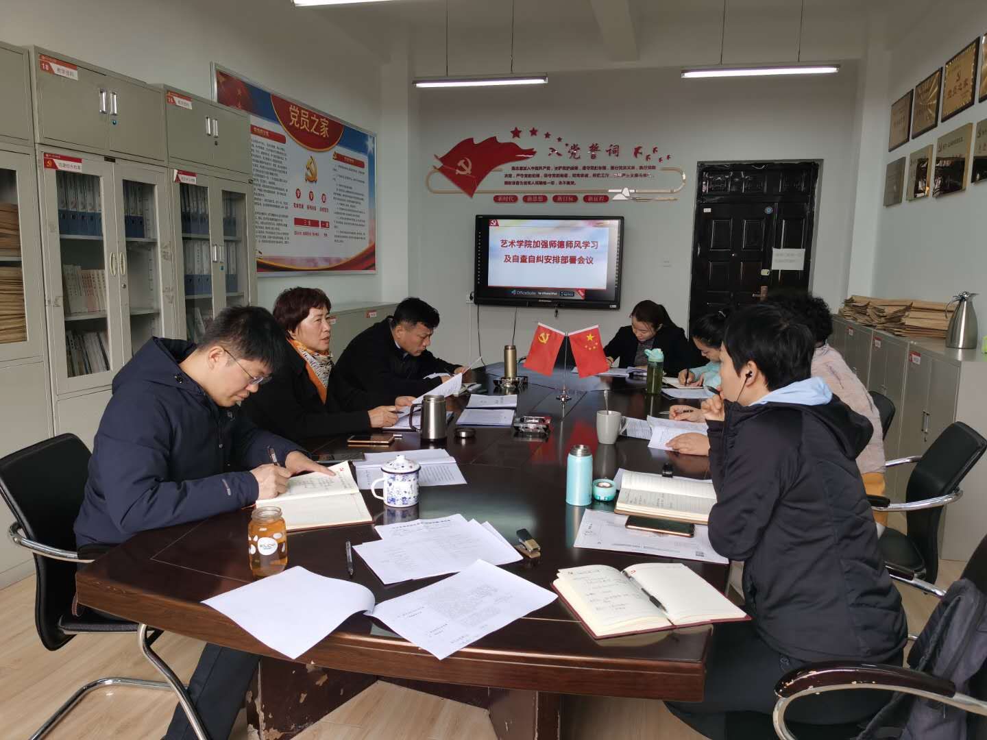 夏瑞丽书记组织与会同志集体学习了《中北大学师德师风建设学习资料汇编》、《关于加强师德师风建设开展师德师风自查自纠和专项整治工作的通知》、《新时代高校教师职业行为十项准则》、《教育部关于高校教师师德失范行为处理的指导意见》、《中北大学教师师德师风考核办法》、《中北大学师德失范行为处理办法》等等相关内容,结合学院具体工作从坚定政治方向、自觉爱国守法、潜心教书育人、关心关爱学生、秉持公平诚信、坚守廉洁自律等方面进行了解读。