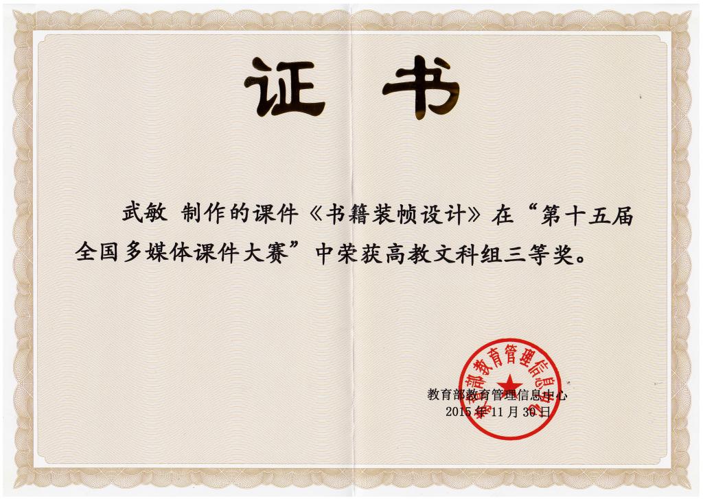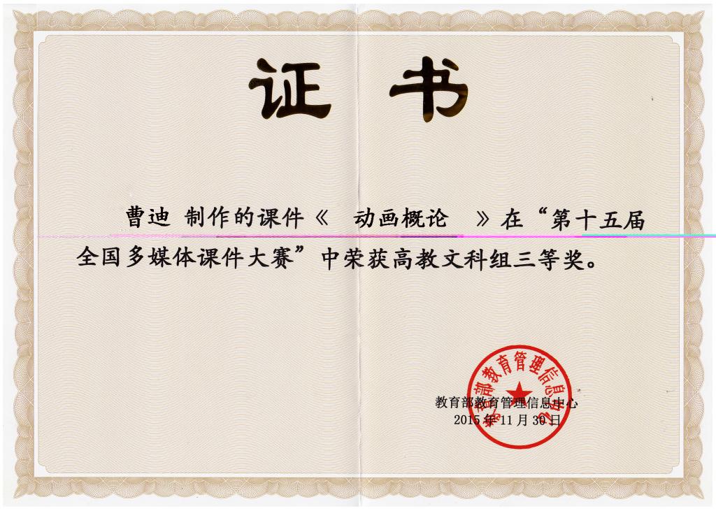 近日,由教育部教育管理信息中心主办的“第十五届全国多媒休课件大赛”圆满结束。根据教育部教育管理信息中心《关于公布第十五届全国多媒体课件大赛获奖名单的通知》(教信息中心[2015]80号)文件,我院报送的曹迪老师的《动画概论》多媒体课件、武敏老师的《书籍装帧设计》多媒体课件经过初审、复审与决赛,均荣获高教文科组三等奖,张奋飞老师制作的《摄影创意思维的发现与表达》荣获高教文科组优秀奖。通过组织参加全国多媒体课件大赛,进一步提高了我院教师开展多媒体教学研究与实践的积极性,促进了教学方法和教学手段的改革,为本科教学质量的提升起到了积极的推动作用。