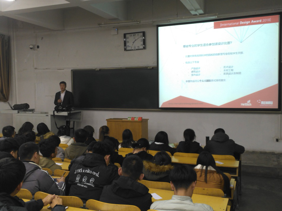 2017年12月1日晚,英国正版365邀请北京林业大学教授、德国海蒂诗五金配件(上海)有限公司技术总监赵小矛作了关于“International Design Award 2018”的辅导讲座,产品设计、视觉传达设计专业各年级学生近200人前往聆听。