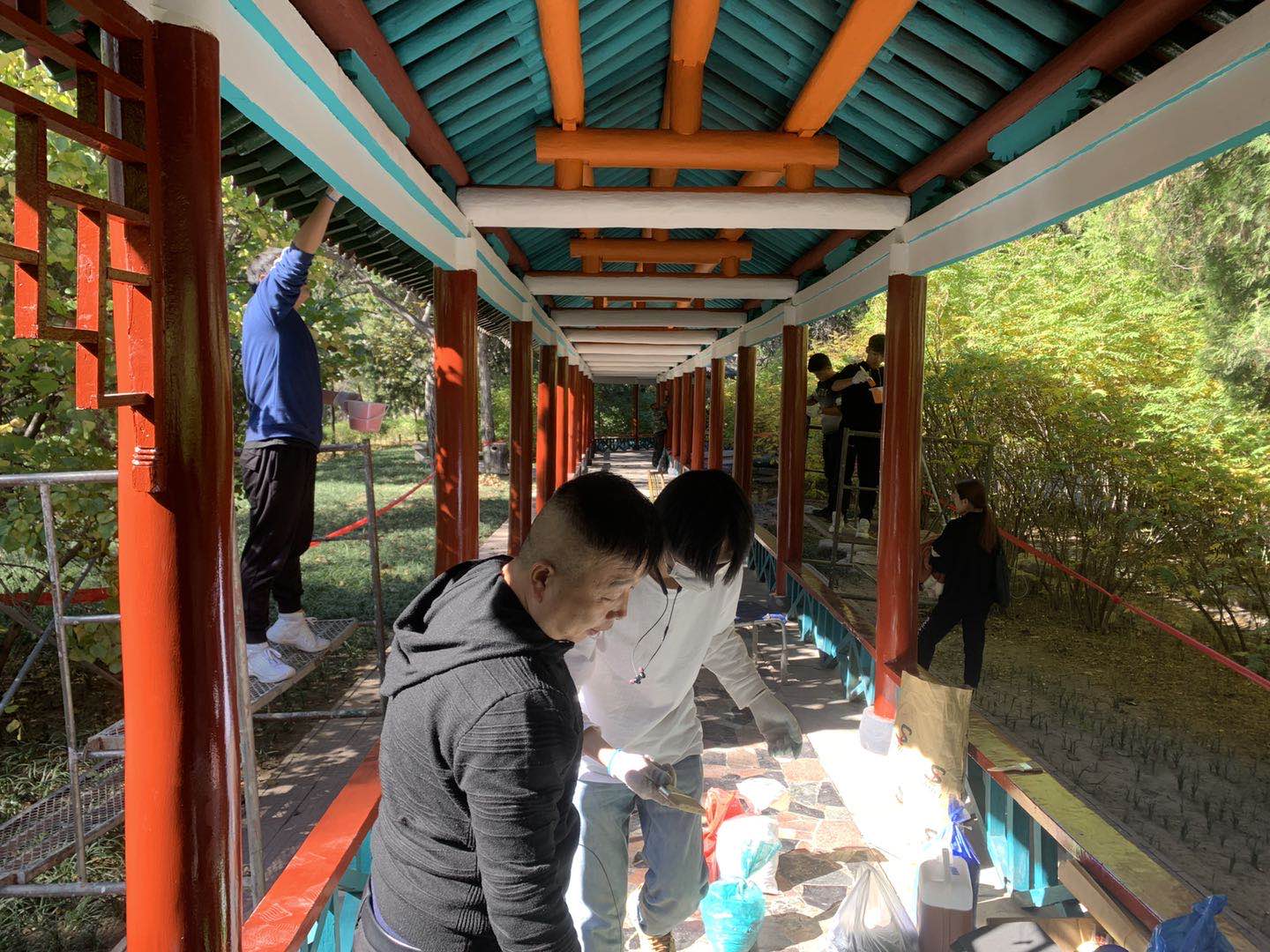 10月31日下午,杨正民处长与夏瑞丽书记分别带领相关负责同志及部分学生代表步行来到柏林园入口处共同参观长廊彩绘工作完成情况并进行了简短的剪彩仪式,此次长廊翻新工作由后勤管理处校园绿化中心具体负责,先后对廊体进行维修、加固、廊顶古砖修补及枯枝树叶的清理,并将长廊彩绘工作由英国正版365申旭栋老师负责,组织二十余名学生加班加点、精心描绘,用时13天时间将77米长廊全部彩绘完成,长廊彩绘效果整体简洁大方,枋粱上绘有山水、花鸟、风景图案,其线条细腻、形象逼真,极大地改善了长廊整体面貌,提高了柏林园整体美观效果,更好地为我校师生提供了学习、休闲、娱乐的好去处,为迎接我校80周年校庆和实现“百年百强”中北梦做出积极贡献。
