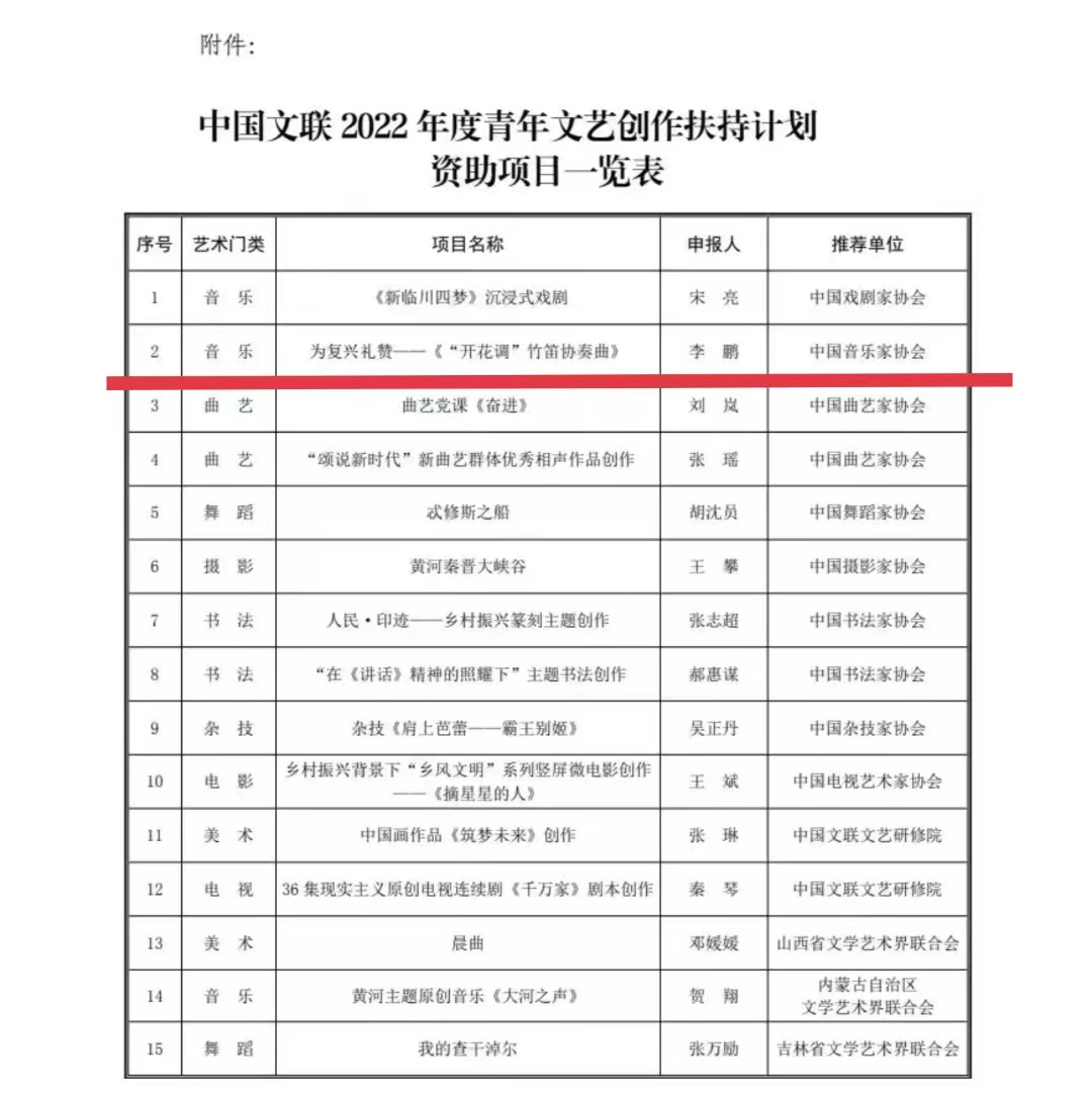 在二十大到来之际,为了继承、发扬中华优秀传统文化,为建设“中国传统文化强国”助力, 用璀璨文化之光照亮高质量发展之路,以优异成绩迎接党的二十大胜利召开,英国正版365李鹏老师代表中国音乐家协会创作的竹笛与管弦乐队创作中型协奏曲:为复兴礼赞—《“开花调”竹笛协奏曲》荣获中国文联2022年度青年文艺创作扶持计划资助。