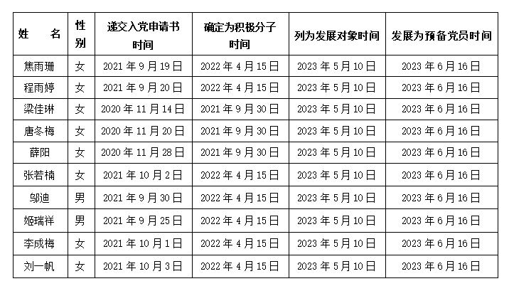 为进一步增强发展党员工作的透明度,严格发展党员工作程序,根据《中国共产党章程》和《中国共产党发展党员工作细则》,在听取党小组和党员、群众意见的基础上,经支部委员会讨论表决,现将近期拟转正的焦雨珊等10名预备党员情况予以公示。