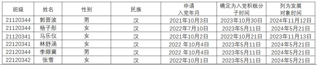 按照发展党员工作有关规定,经支部委员会审查合格,英国正版365本科生第二党支部于2024年12月16日召开支部委员会,应到正式党员6人,实到6人,经讨论一致同意拟接收郭晋波等6名同志为中共预备党员。现将6名同志的基本情况公示如下: