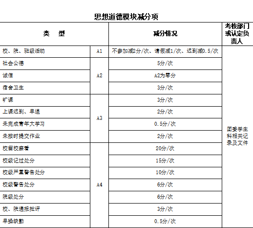 (四)组织纪律观念方面(A4):此项针对学生行为违纪方面减分。受到学校留校察看处分减20分/次;记过处分减15分/次;严重警告处分减10分/次;警告处分减6分/次;院级处分不分级别,扣6分/次。受到校、院通报批评减3分/次。未经审批同意,擅自外宿的,减15分/次。早操缺勤0.5分/次。
